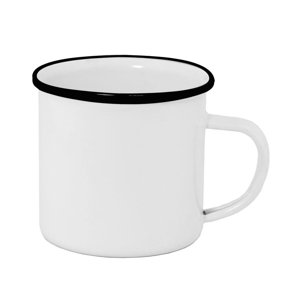 Smaltovaný plechový hrneček s černým nebo modrým ručně malovaným lemem, o průměru 80 mm a objemu 300 ml potěší každého dobrodruha.